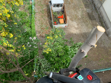本日も昨日に引き続き伐採や草刈り、草集めと剪定のご依頼をいただいたお客様の2日目の作業をいたします。 本日もボリュームがございますので段取り良く作業を進めたいと存じます。