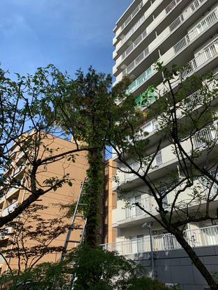 本日も引き続き昨日のお客様のヒバの伐採、草刈り、ツタ取りと清掃作業をいたします。本日は作業完了予定の日です。ヒバの伐採から始めます。