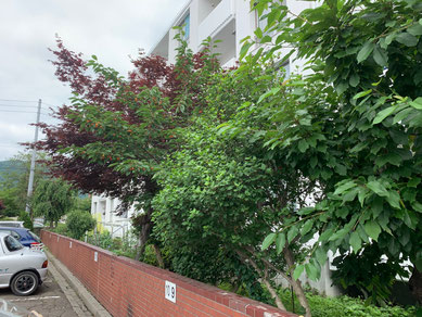 本日のお客様はノムラモミジ、サクランボ、ムクゲとレンギョウの伐採をご依頼いただきましたお客様です。 本日はマンションですので素早く伐採を行います。前もって管理人様とご依頼主様とのご連絡で車など移動して下さる手配などをいただき誠にありがとうございました。