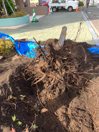 本日は昨日の桜の伐採をご依頼いただいたお客様の続きの作業をいたします。こちらの花壇には花を植える予定となっておりますので、抜根を行う前に花壇表面の苔や砂を取り除く作業から始めました。